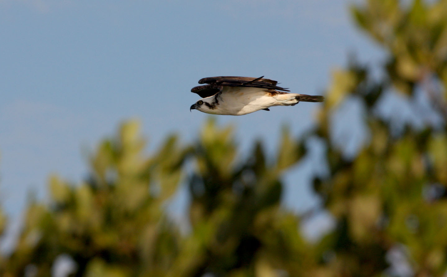 Above, an Osprey skims over the tops of Buttonwoods near the observation deck. The quickly changing topography of the Curry Hammock site is often a topic of conversation. The Buttonwood is a fast-growing hardwood associated with mangrove and coastal habitat. Several of the trees in the vicinity have grown to the point that they may soon obstruct our view of key flight trajectories. On the other hand, it is often interesting to watch certain species “hot-dog” their way through the growing foliage, particularly Merlins, Harriers and Accipiters.