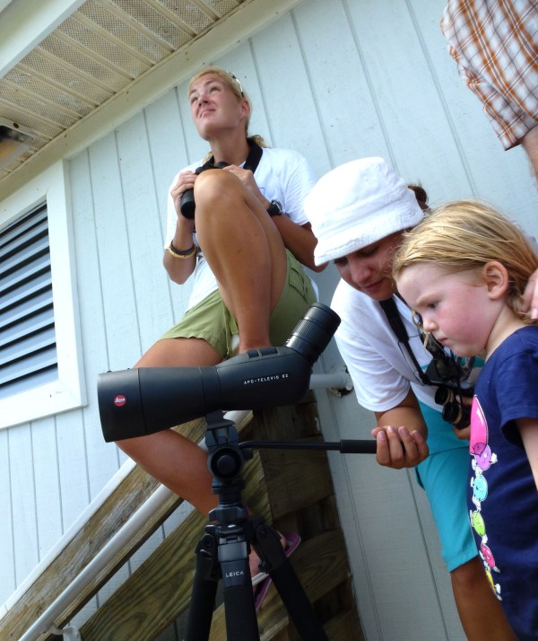 Left – Christine on her favorite perch keeping eagle eyes on the sky. Although she claimed her vision was not up to par, she proved to be an excellent spotter, often picking out birds before anyone else got to them. Below her, Samantha helps a visitor use the scope.