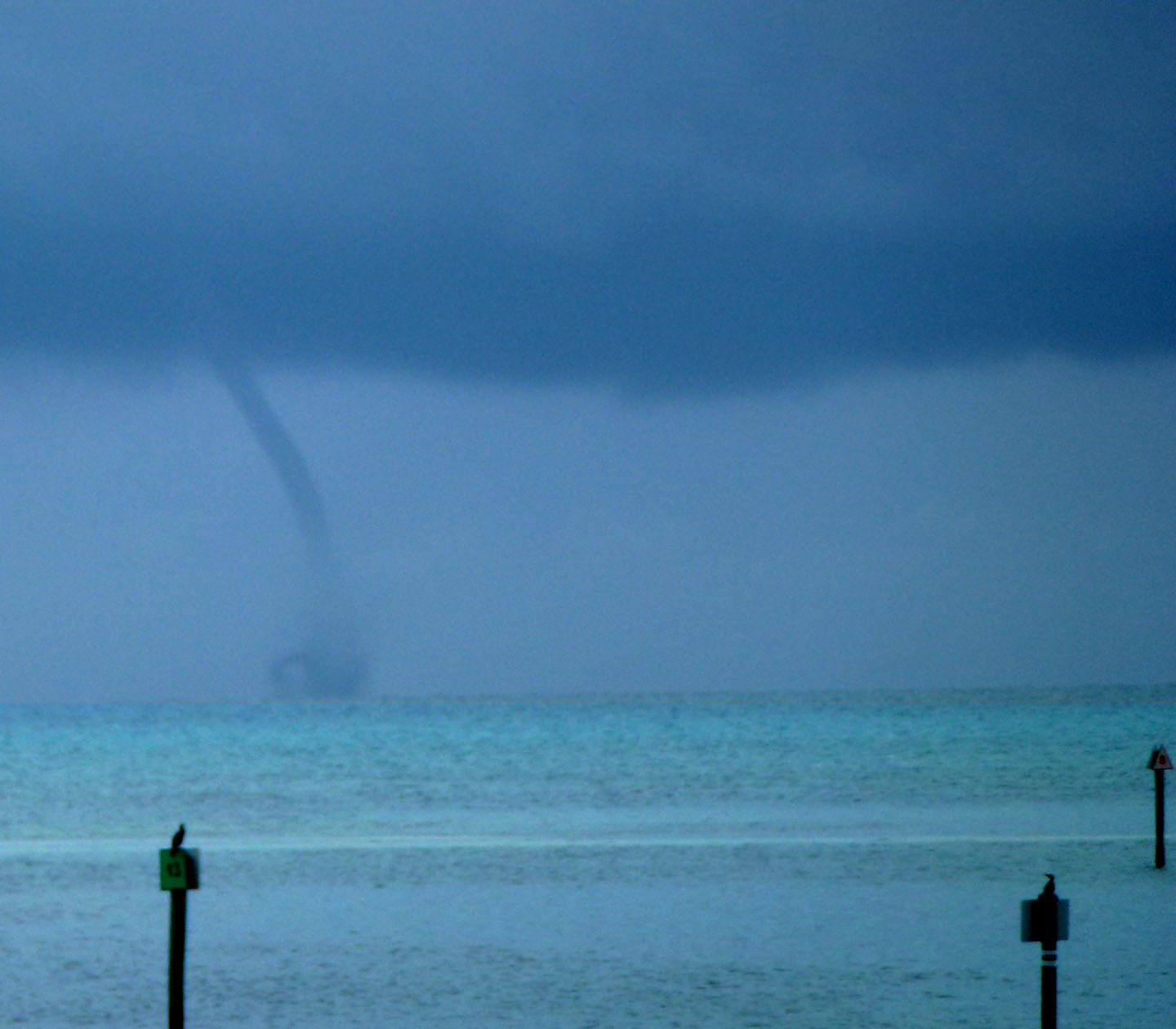 The threat of rain was ever-present throughout the day, with some serious stratocumulus clouds and several waterspouts offshore, in the Atlantic Ocean. Above is a photo of a waterspouts spotted from the hawkwatch deck. Southernmost Florida, particularly Florida Bay and the Middle Keys are considered the waterspout capital of the world. A waterspout monitoring project conducted from May to September of 1969 documented 400 waterspouts in this area. There are several documented cases attesting to the damaging power of these columns of twisting water. When associated with the type of thunderstorm activity we had last night, they are considered “tornadic waterspouts” – in other words, they are tornadoes over water. Their wind speeds have been documented exceeding 160 miles per hour. There have been several documented cases of waterspouts crossing from Florida Bay, over the Keys landmass, into the Atlantic; or of waterspouts turning into tornadoes as they reach land and vice-versa.