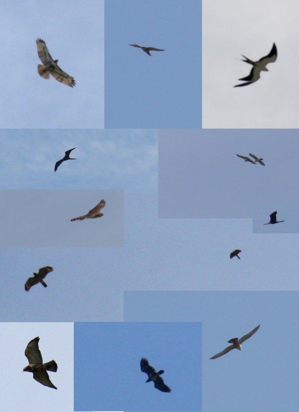 Top-most: left to right, a Bald Eagle and a Broad-winged Hawk, two of 163 Peregrines seen today, and a Cooper’s Hawk. Photos by Julie Reagan. Below is a composite of raptors I have put together from Julie’s photos. See if you can guess what species they are.