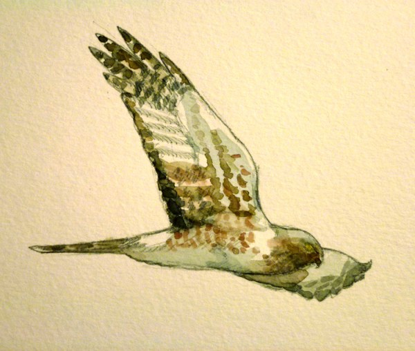 However, I must confess that harriers always rank near the top for me. A special moment was when we saw four young Northern Harriers migrating over the Atlantic southwestward. All were juveniles except one transitional male in second calendar-year plumage, which I’ve sketched above. I have seen this plumage before – especially in Europe – but not often in South Florida. For anyone that knows the Montagu’s Harrier – that is what you are reminded of. Today’s bird had many traits of a full adult male, but the head and upper chest retained much brown coloration. The body was pale, but rusty cockades streaked the flanks, axillaries and underwing coverts – truly a beautiful impression. Most interestingly perhaps, the black trailing edge of the wing, present in adult males, was incomplete, and the flight feathers were a mixture of juvenile and adult feathers. The sketch above is only meant to conjure the general idea of the bird, which we had on the scope for all-too-briefly. Look out for such birds – they are startling.