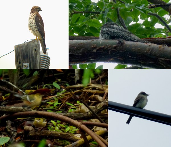 The photo composite above was taken handheld using a Leice V-Lux 30. Clockwise: Broad-winged Hawk juv., Nighthawk sp., Eastern Wood-Pewee, and Bay-breasted Warblers. One of the highlights of the current weather event and related migration activity has been the presence of more Bay-breasted Warbler than I can ever remember in South Florida before.