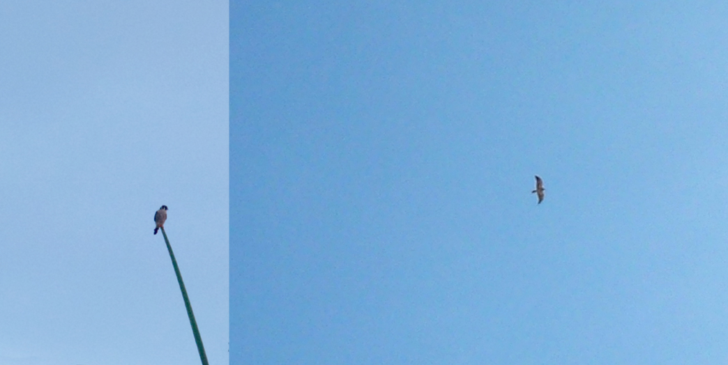 Top most photo composite of very distant perched American Kestrel (adult male) and a Swainson’s Hawk. Shot handheld using a Leica V-Lux 30 digital camera.