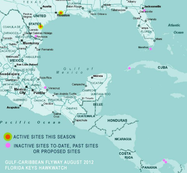 The fall 2011 season had as many as 8 raptor monitoring sites across the Gulf of Mexico and Caribbean Region. We can only hope that all those sites will maintain activity this fall of 2012. The active sites from the fall of 2011 included:
