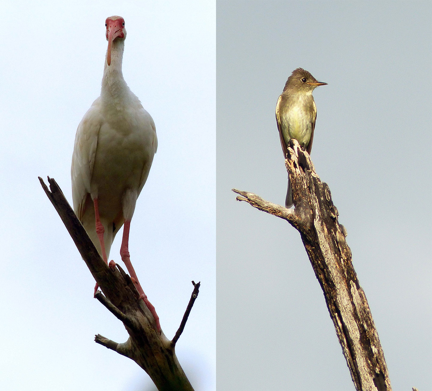 GALVEZ PEFA L1060303Some days, you can see as many as 10 Peregrines perched atop the snags surrounding the salt pan. But raptors are not the only ones using these snags. It is not unusual to see wading birds and passerines of all kinds using these perches. Below, a White Ibis and an Eastern Wood-Pewee are on the lookout. Bottom photo: A Reddish Egret and a Double-crested Cormorant perch on the petrified trunk of a toppled mangrove succumbed to the tides.