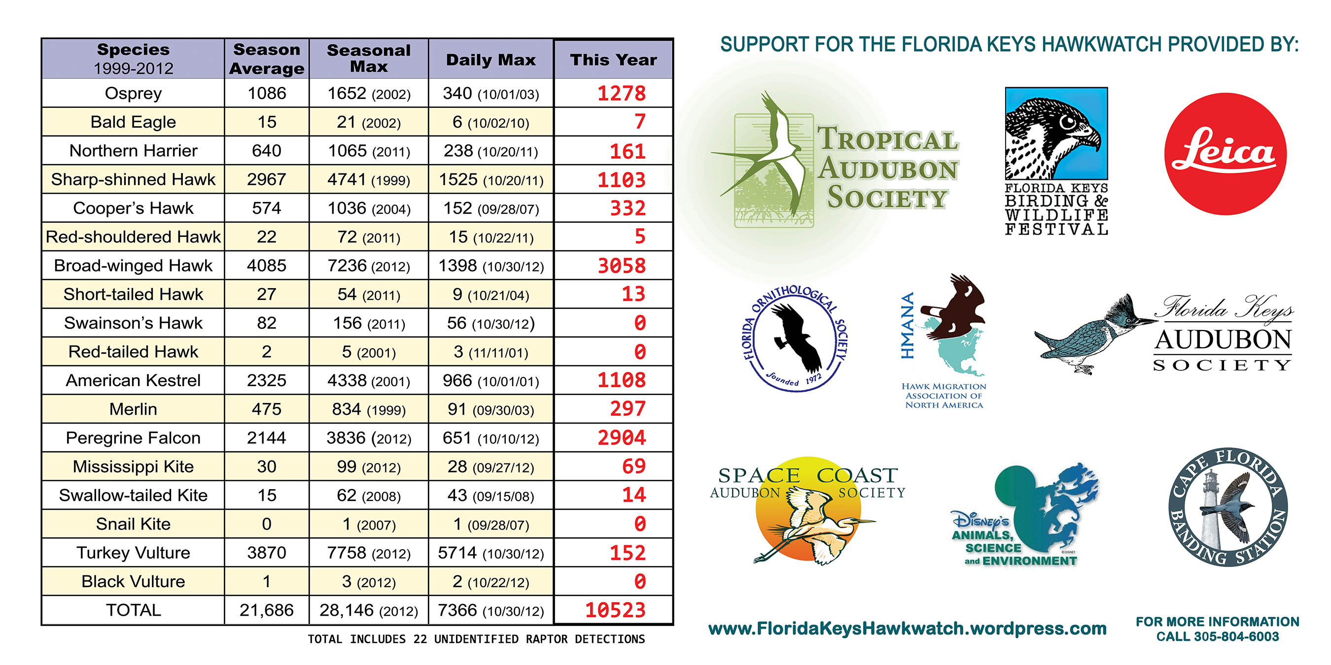 The following are count totals for the Florida Keys Hawkwatch through end-of-count-day, October 10, 2013. The count season will continue through the first week of November. For a breakdown of daily counts, visit HawkCount.org.