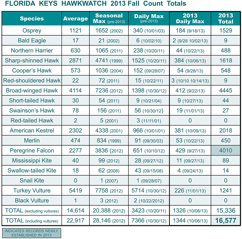The chart above summarizes the number of birds tallied from September 15 through November 3, 2013, including daily maxima per species for that season. The chart also compares previous seasonal and daily maxima, and presents a count site average for each species (1999-2012). The presented “totals” include 38 birds categorized as unknown Accipiter, unknown Buteo, unknown falcon, or unknown raptor. For a daily breakdown of migratory bird of prey counts at the Florida Keys Hawkwatch (Curry Hammock State Park), and detailed comparisons with previous seasons, visit HawkCount.org.