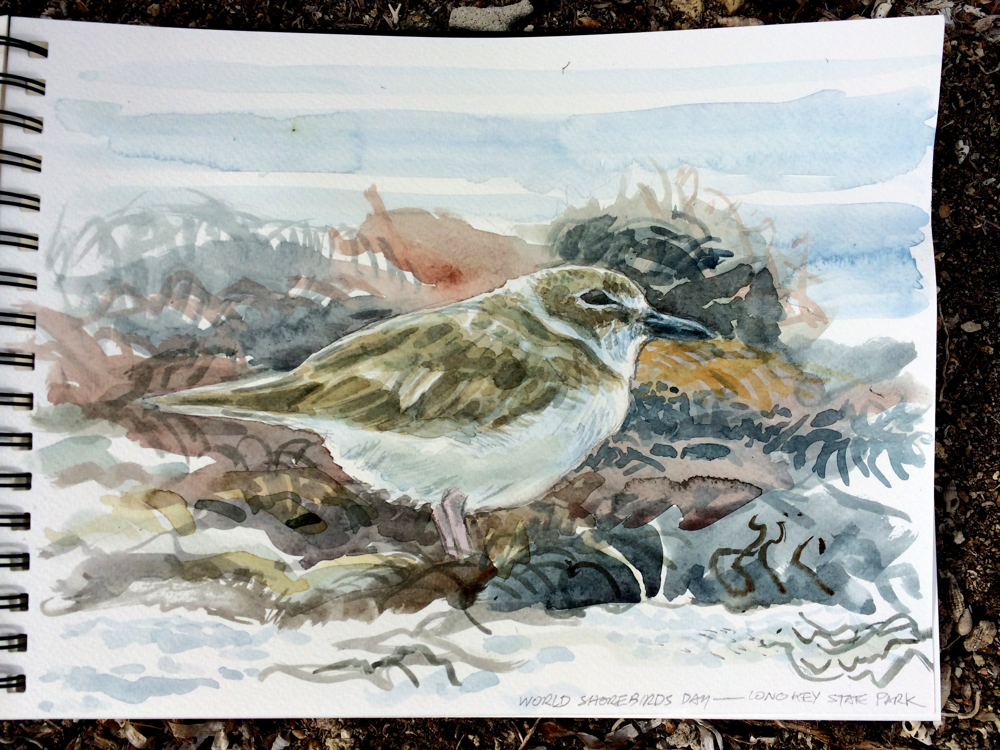 Although we had miles of transect counts to run and a hawkwatch to monitor, I took a bit of extra time to sit by the shoreline and do a few watercolor sketches of my favorite plovers. It rained, the wind went from still – perfect for the thousands of sand fleas – to gusty, picking up sand and foam. Finally the sun came out; temperatures rising to 91 F (32.7 C) degrees. All the while, flocks of shorebirds worked the wrack line, and as I sketched, I was allowed brief snippets into the complex lives of a number of fascinating birds.