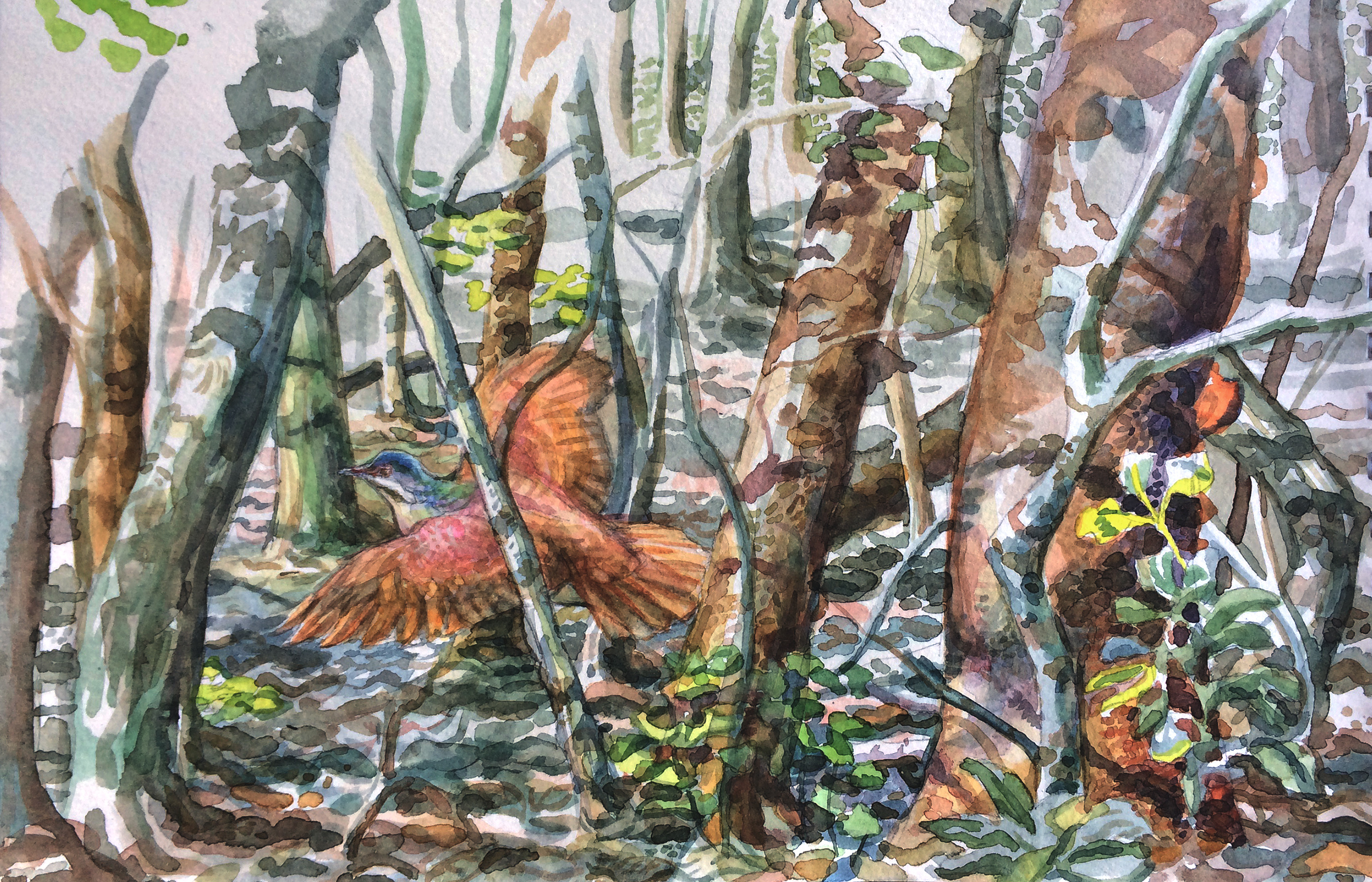 Reinterpretation of a field sketch of a Key West Quail-Dove observed flying through the hammock understory at Long Key. By Rafael Galvez.