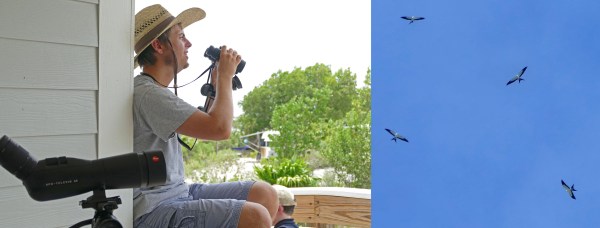 Kenny Fowler scans the skies from the hawkwatch deck looking for additional kites after the passage of back-to-back groups of Swallow-tails.