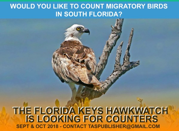 The Florida Keys 2018 migration monitoring season will run from September 7 through October 31. We are still looking for full-time, part-time and volunteer counters.