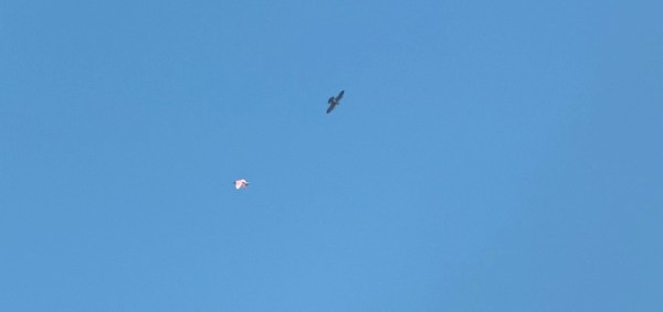 A Peregrine Falcon joins a Roseate Spoonbill in flight. Photo by Luis Gles.