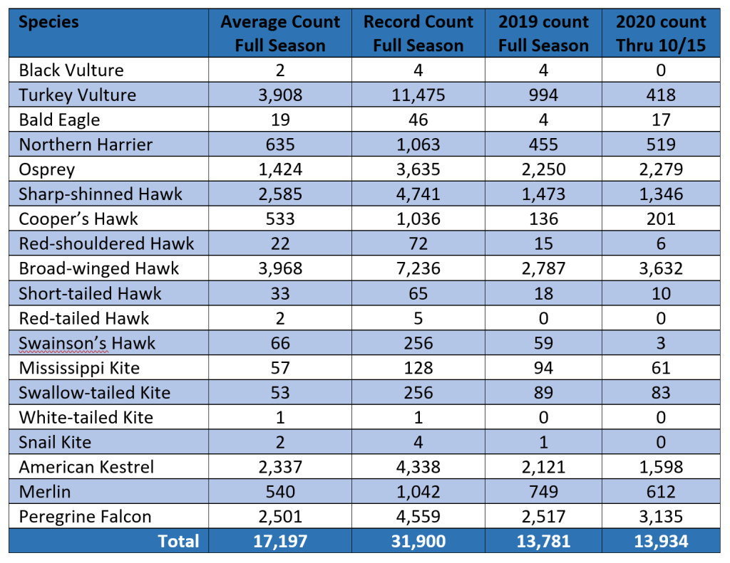 We couldn’t be happier with our amazing results through the first half of the season! The 2020 count began September 15th and will run through November 15th. It’s always a challenge with timing, when we begin earlier we catch more of the iconic Swallow-tailed Kites. These fascinating birds migrate through Florida by the thousands, but they begin their southward migration in mid-July. Even though it would be extremely interesting to monitor this poorly understood Swallow-tailed Kite migration, this would literally double the length & expense of our typical two-month count season! Unfortunately, it would be a rough stretch for counters as there would be little else migrating and it’s exceptionally hot, but still it is a goal of ours to one day add a Swallow-tailed Kite migration watch!